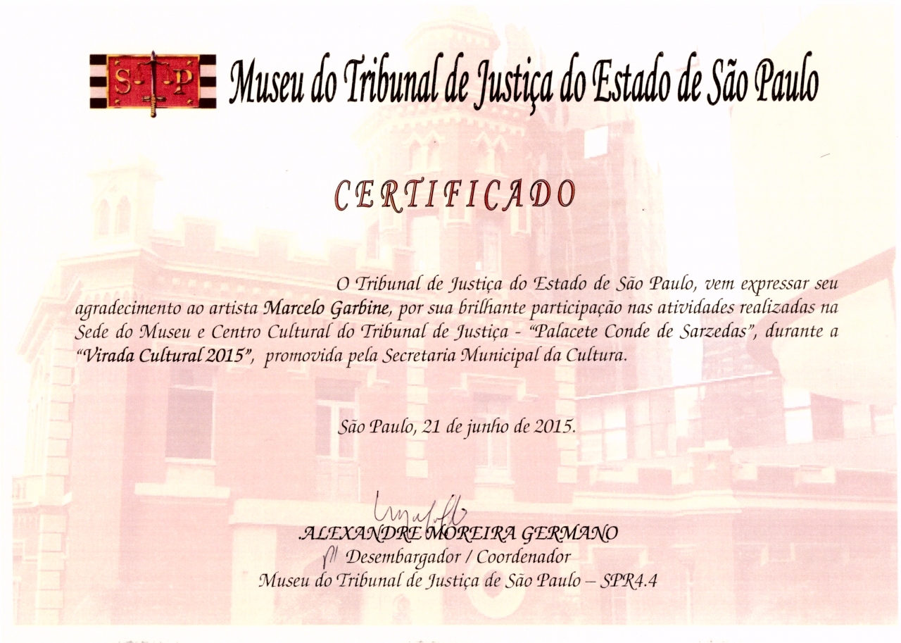 Certificado assinado pelo Excelentíssimo Senhor Desembargador Doutor Alexandre Germano, coordenador do Museu do Tribunal de Justiça do Estado de São Paulo